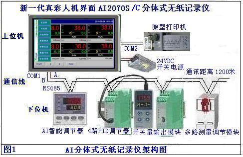 1、上位機:新一代真彩人機界面AI-2070S/C分體式無紙記錄儀,使用宇電AI系列調(diào)節(jié)儀表作為測控輸入模塊實現(xiàn)多通道數(shù)字全屏顯示。測控儀表不僅包括各類溫度、壓力、等信號,也包括人工智能PID調(diào)節(jié)、可按需要配置,任意組合;