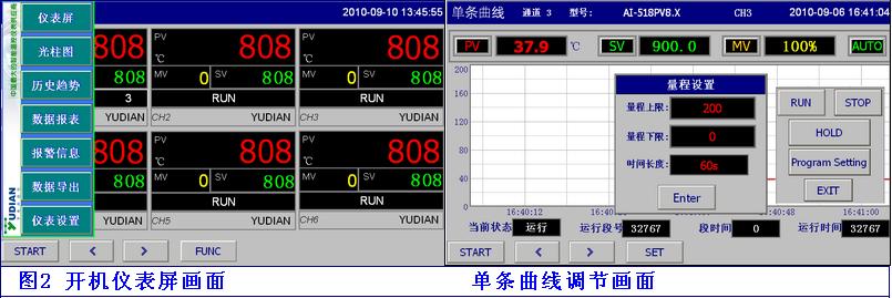 在屏上控制操作程序儀表【啟動】【停止】【暫?!?、在運行狀態(tài)下切換【手動/自動】狀態(tài),手動控制輸出量;即時修改【段號】,指定運行段;及修改儀表控制參數(shù)等多種功能;追憶記錄的溫度曲線數(shù)據(jù)。數(shù)據(jù)報表、報警報表的打印。